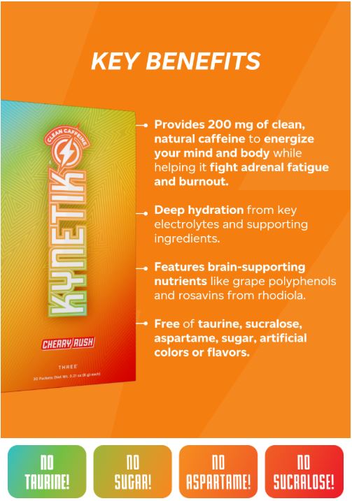 A: Absolutely. Kynetik contains no artificial sweeteners, colors, or flavors—and it’s free of taurine, sugar, aspartame, and sucralose.